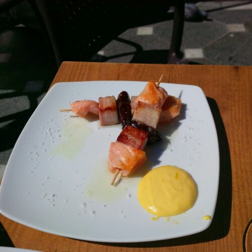 2) Meat on a stick (or Brochettas on the menu) are bite-sized squares of salmon, bacon and a date, baked on a stick. SO good. You get two little sticks to a portion, with a little puddle of mayo on the side. I don’t eat the mayo. (There is another meat on a stick option on the menu that has other meat along with a chunk of baked cheese. Those who have tried it say it’s delicious. I prefer the non-cheese date option- OMG when Rachel ordered it she didn’t like the dates and let me have them. I like dates.)