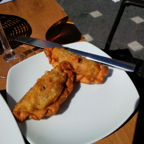 1) Meat Pockets (or Empanadillas, as they’re called on the menu, “Argentine Pie” in their English translation) – pastry filled with ground pork and flecks of pepper, or other veggies maybe (I can’t tell because they’re flecks) and herbs. The tapa portion gives you two pockets on a plate. Good size, not too big and they aren’t messy to eat.