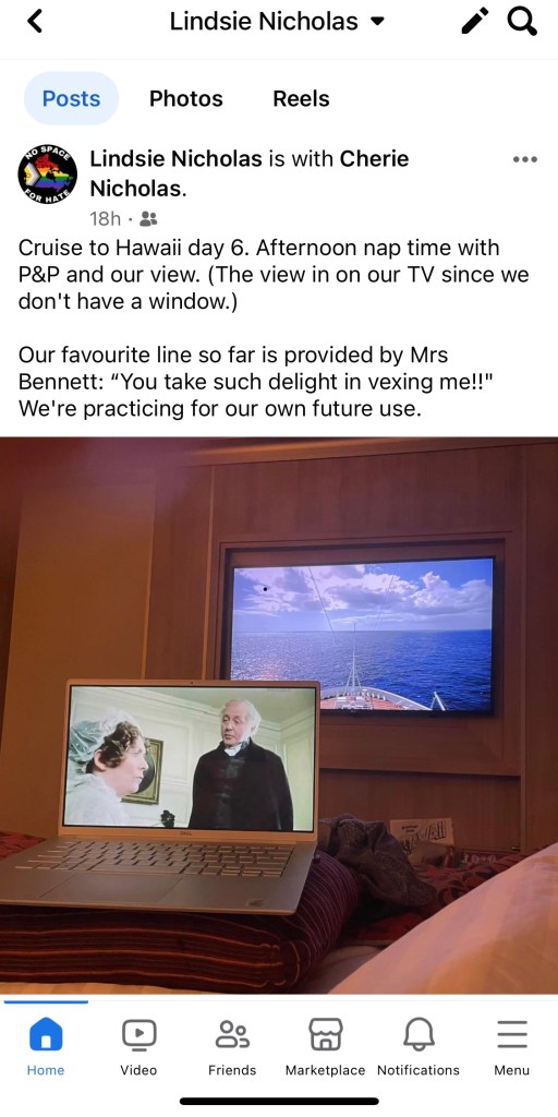 Seriously a day to relax. We went for a swim after breakfast, then I went to the morning lecture (about two of Hawaii’s major symbols: the ukulele and the Hawaiian Shirt – AKA Aloha Shirts). Then nothing for the rest of the day? After lunch we put on the 2005 Pride and Prejudice to watch while napping.