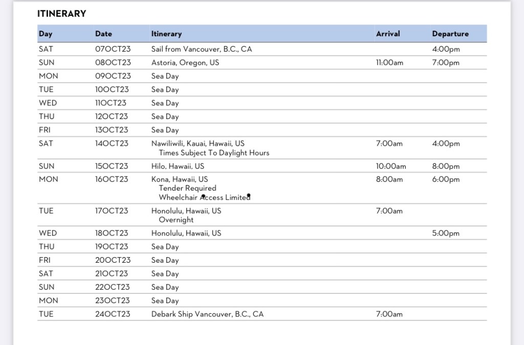 My second search was to see where else we might travel that both started and ended in Vancouver. This was the itinerary for our Alaska trip and we liked that. The one of these I liked best runs Vancouver to Vancouver via Hawaii and is 17 days. Seventeen days sounded a lot better than 7 days. That includes 10 days at sea (there and back) and 5 days around Hawaii. I emailed the link to Mum ” How about this or is it too long?” and managed to twist her rubber arm. And that’s what we’re starting off on today.